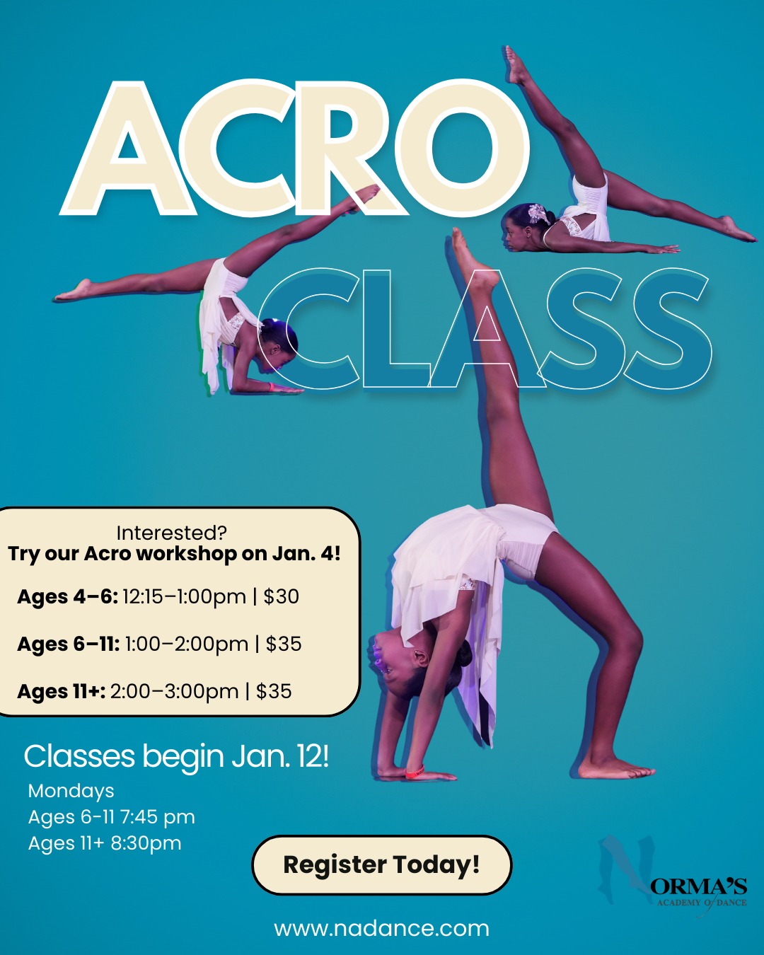Ballet, Tap, Jazz, Hip Hop, Contemporary, and NEW this semester - Acro!