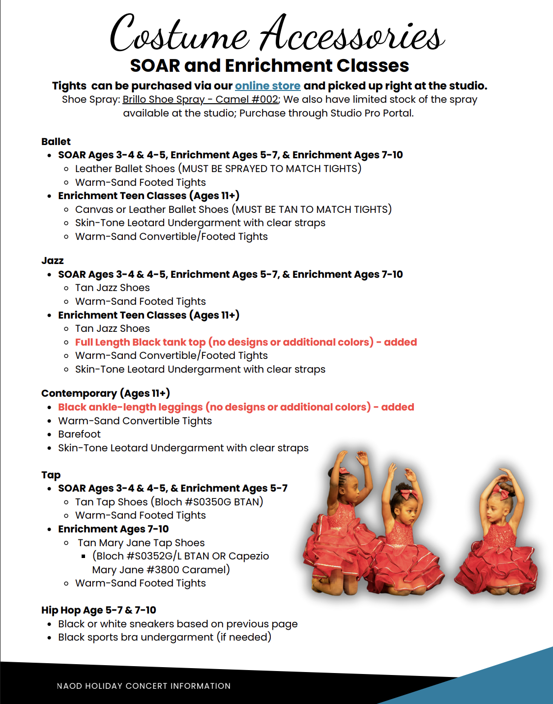 Some classes require additional costume items that must be purchased separately by families. Please review the details below and the Holiday Concert Handbook to ensure your dancer has everything they need for the Holiday Concert.