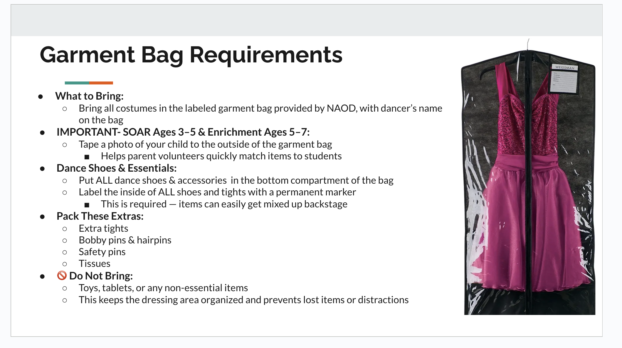 Arrive to the concert in full costume with garment bag and a cover-up on top. (Label garment bag & all costume pieces and shoes with your dancer’s name. No pullover hoodies, sweaters, etc.)