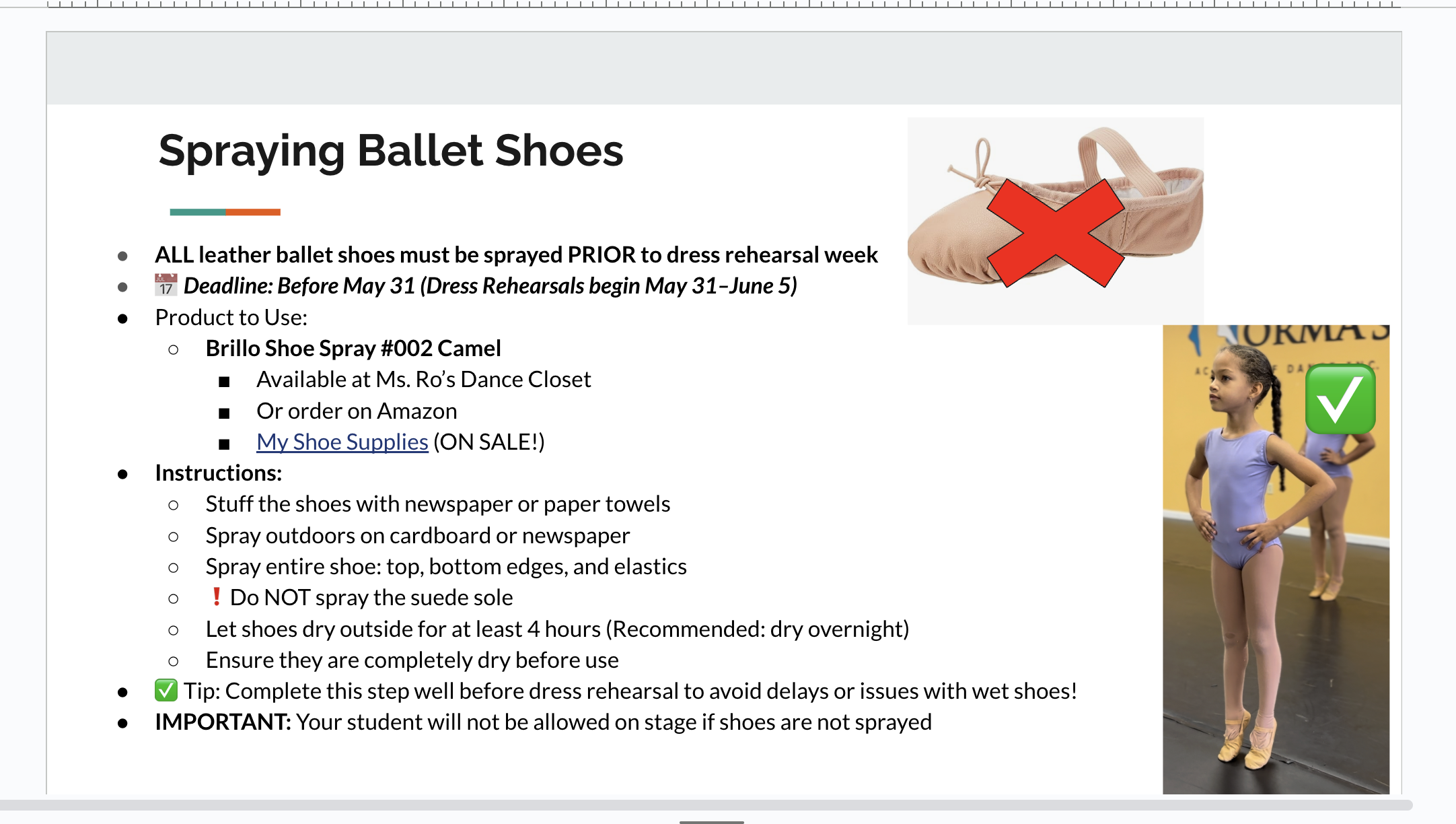 All leather ballet shoes must be sprayed prior to Dress Rehearsal Week. (Your dancer cannot perform if ballet shoes are unsprayed)