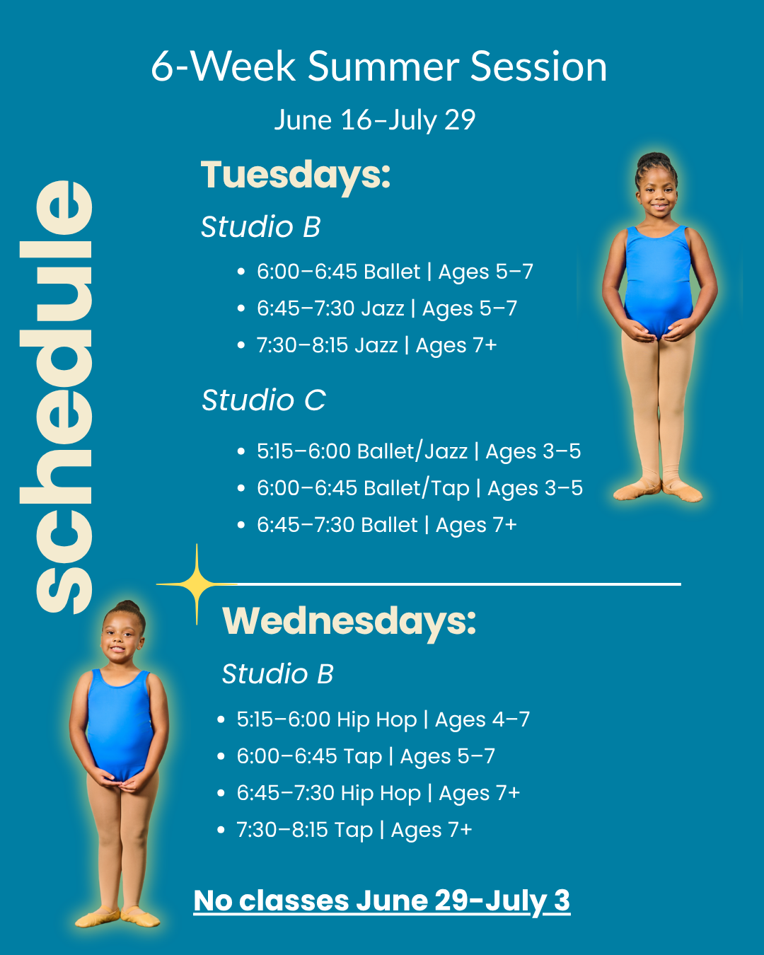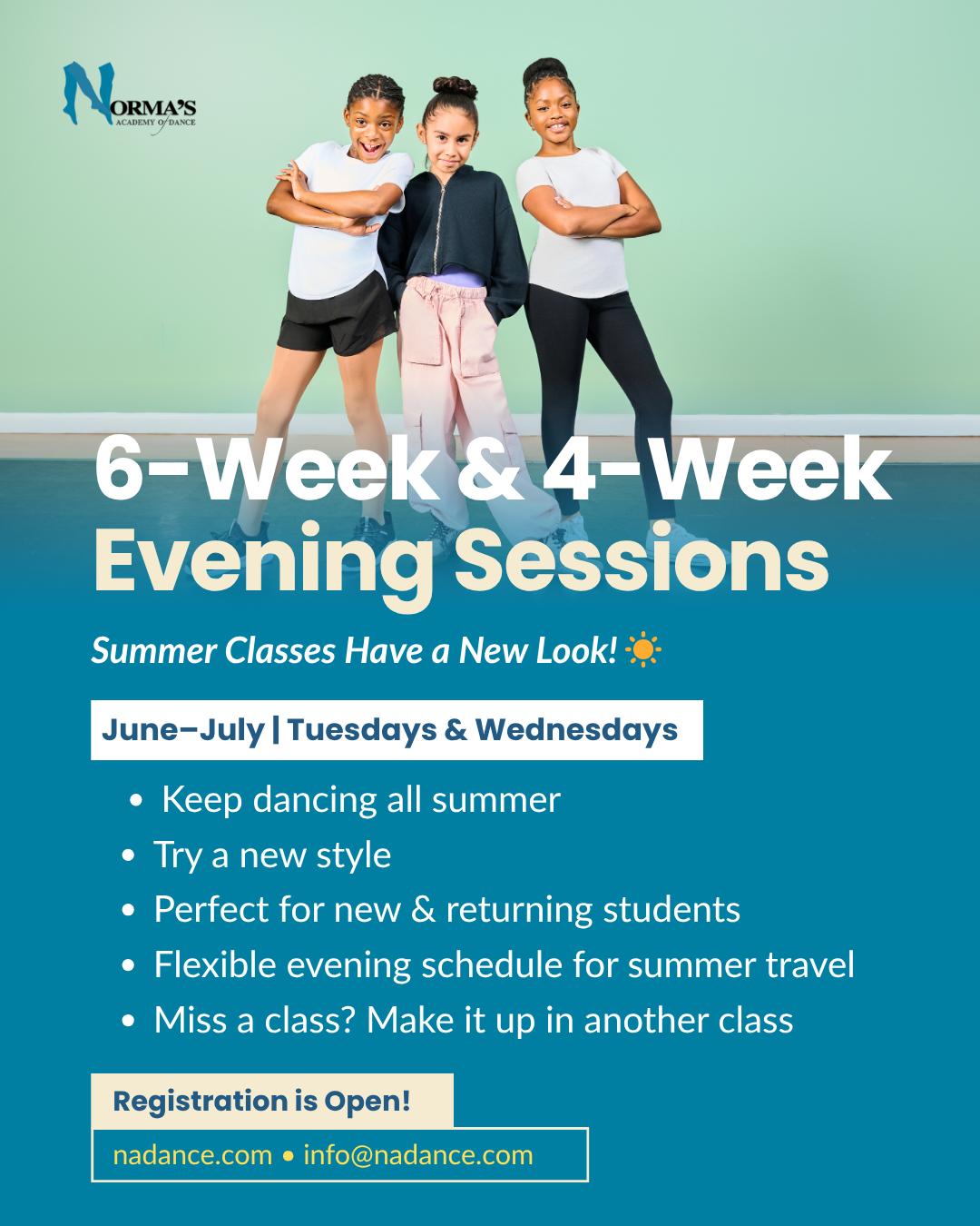 Our summer class sessions are designed to give families flexibility without losing momentum. With evening classes on Tuesdays and Wednesdays, dancers can stay active, keep progressing, and enjoy summer travel without committing to a full-season schedule.